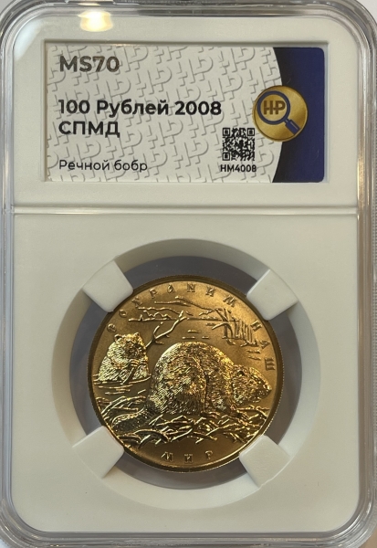 в центре диска - эмблема Банка России (двуглавый орел с опущенными крыльями, под ним надпись полукругом "БАНК РОССИИ"), обрамленная кругом из точек и надписями по кругу: вверху - "СТО РУБЛЕЙ", внизу - "2008 г.", слева - обозначение металла, проба сплава, справа - содержание драгоценного металла в чистоте и товарный знак монетного двора.