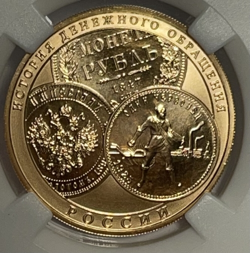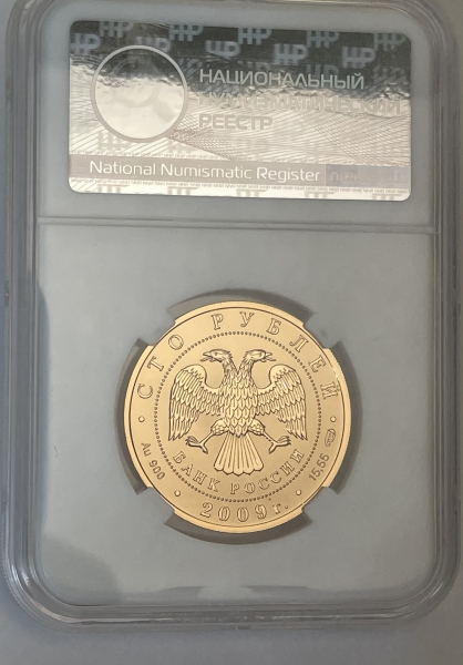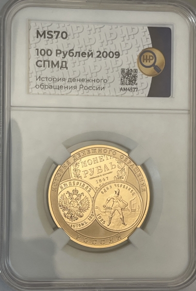 Золотая монета 100 рублей "История Денежного Обращения" 2009 г. в слабе ННР MS 70