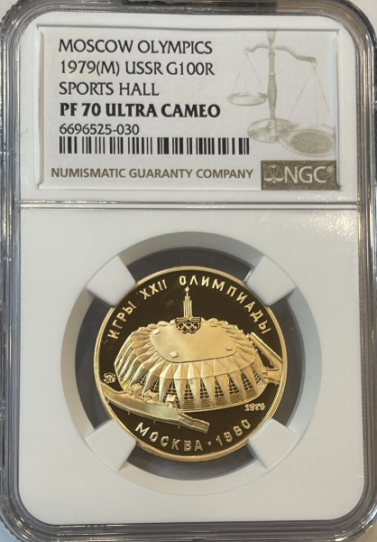 Золотая монета 100 рублей "Спортивный зал Дружба" ММД, 1979г. в слабе NGC PROOF 70 ULTRA CAMEO