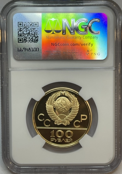 Золотая монета 100 рублей "Гребной канал в Крылатском" Олимпиада 80, 1978г., в слабе NGC PROOF 70 ULTRA CAMEO