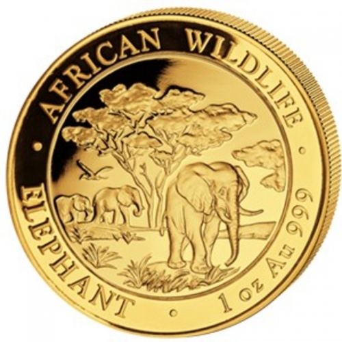 В центре изображение Африканских слонов. По кругу надписи AFRICAN WILDLIFE ELEPHANT 1 oz Au 0.9999