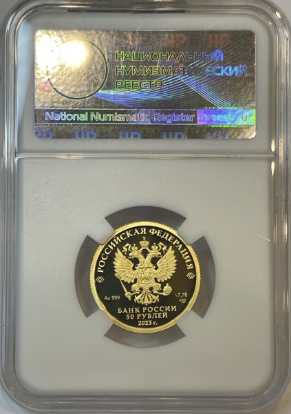 рельефное изображение Государственного герба Российской Федерации, над ним вдоль канта – надпись полукругом: «РОССИЙСКАЯ ФЕДЕРАЦИЯ», обрамленная с обеих сторон сдвоенными ромбами, под гербом: слева – обозначения драгоценного металла и пробы, справа – содержание химически чистого металла и товарный знак монетного двора, внизу в центре в три строки – надпись: «БАНК РОССИИ», номинал монеты: «50 РУБЛЕЙ», год выпуска: «2023 г.».