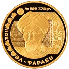 Реверс - в центре изображен портрет великого восточного мыслителя Аль-Фараби (это фрагмент банкноты в 1 тенге). По окружности - имя мыслителя на казахском языке и год чеканки (2011), а также графические изображения с банкноты. Металл монеты, проба и масса указаны в верхней части. Выступающий кант - по окружности.